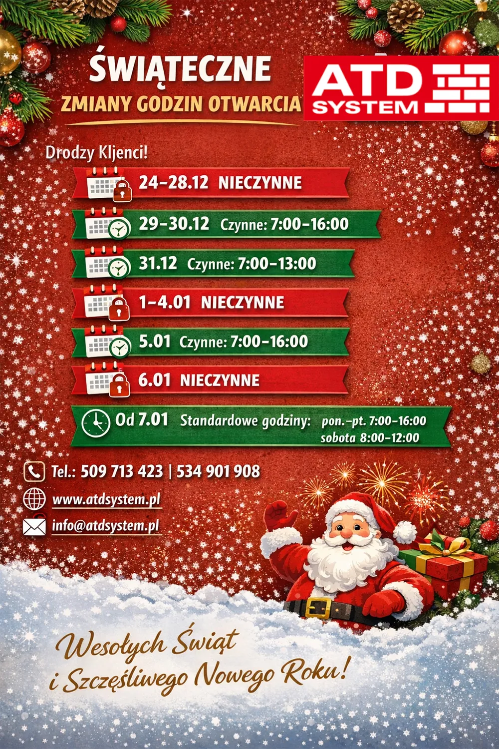 31.12 (środa – Sylwester) – czynne: 7:00–13:00